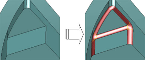 Subject to previously specifying R values at the target ridges before creating fillets, the ridges can be rounded at one time by a single execution of this command. (The "Fillet_Auto" command)