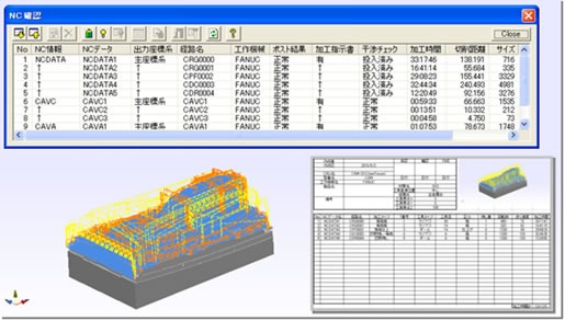 The standard functions for creating NC data are provided in order to support 3-axis Machines, Table 5-axis Machines, and Attachment 5-axis Machines as well as meet individual requirements of machining. Customizable templates of machining instruction manual are also provided. Thus, it is possible to create data that fit the requirements out in the manufacturing field.