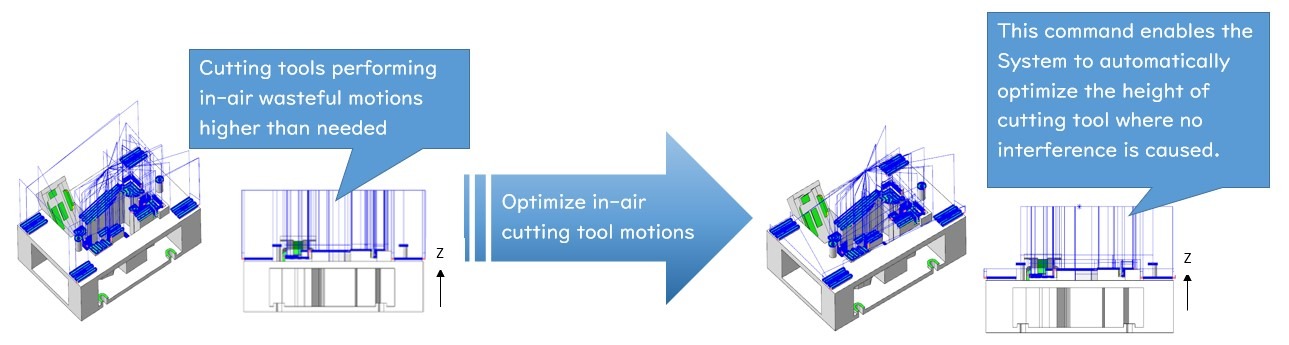 The “OptimizeIn-airCuttingToolMotions” command automatically optimizes in-air motions performed by a cutting tool through vertical adjustments and denies interference.