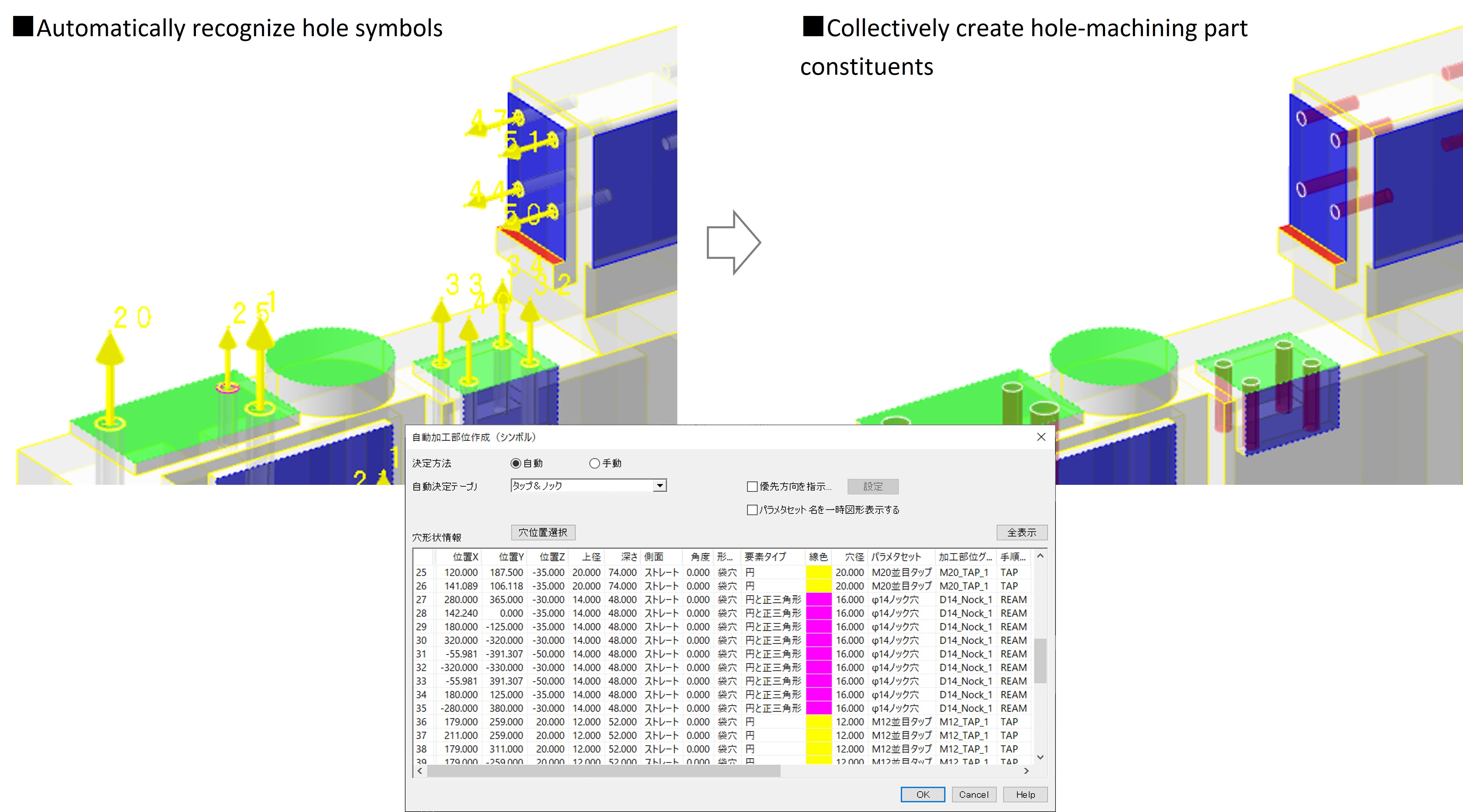 The command automatically decides upon a ’parameter table of hole-machining part consituents’ through the use of ’types, colors and diameters of symbols’. Thus, the command enables a reduction of workload about creating hole-machining data.