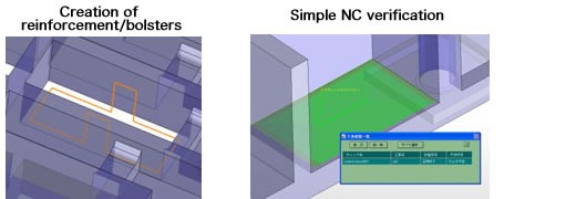 There is a feature for creating bolsters which keep the strength of material when machining the external side. Also, there is a simple NC verification function that automatically removes the portions where interferences are caused by a tool holder.