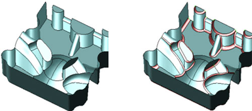 Subject to previously specifying R values at the target ridges before creating fillets, the ridges can be rounded at one time by a single execution of this command. (The "Fillet_Auto" command)