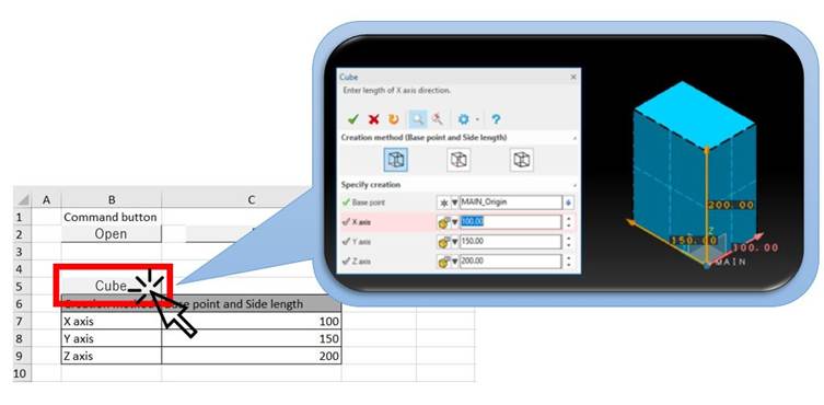 We have expanded the design procedure that incorporates the thoughts of experts and the Excel linkage function that supports work standardization. You can now create buttons on Excel to launch CADmeister commands and Excel-linked add-ins. This function takes the shape dimension value of CADmeister as the cell value of Excel. It can be embedded and the Excel cell value can be reflected in the shape dimension value of CADmeister. It is also possible to control CADmeister file operations and display operations from Excel.