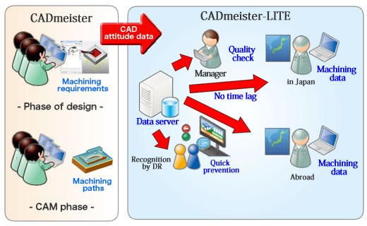 This tool supports users to convey and confirm CAD attribute data mainly of 3D models. It has not only the basic capabilities such as of measurement, but also the capability of confirming CAD attribute data such as design information and CAM information (under development). CADmeister-LITE enables easy understandings of shapes and intentions of designs and machining during the 3D model phases such as of design, CAM and machining. Eventually, this tool enables a reduction of costs and errors.