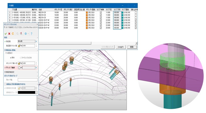 The command automatically decides upon a ’parameter table of hole-machining part consituents’ through the use of ’types, colors and diameters of symbols’. Thus, the command enables a reduction of workload about creating hole-machining data.