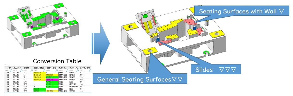 The “ConvertMachiningFeature” command can automatically identify surfaces where Shading Colors (RGB values) are assigned in accordance with the Conversion Table, and collectively add cutting attributes necessary for enabling Path Computation.