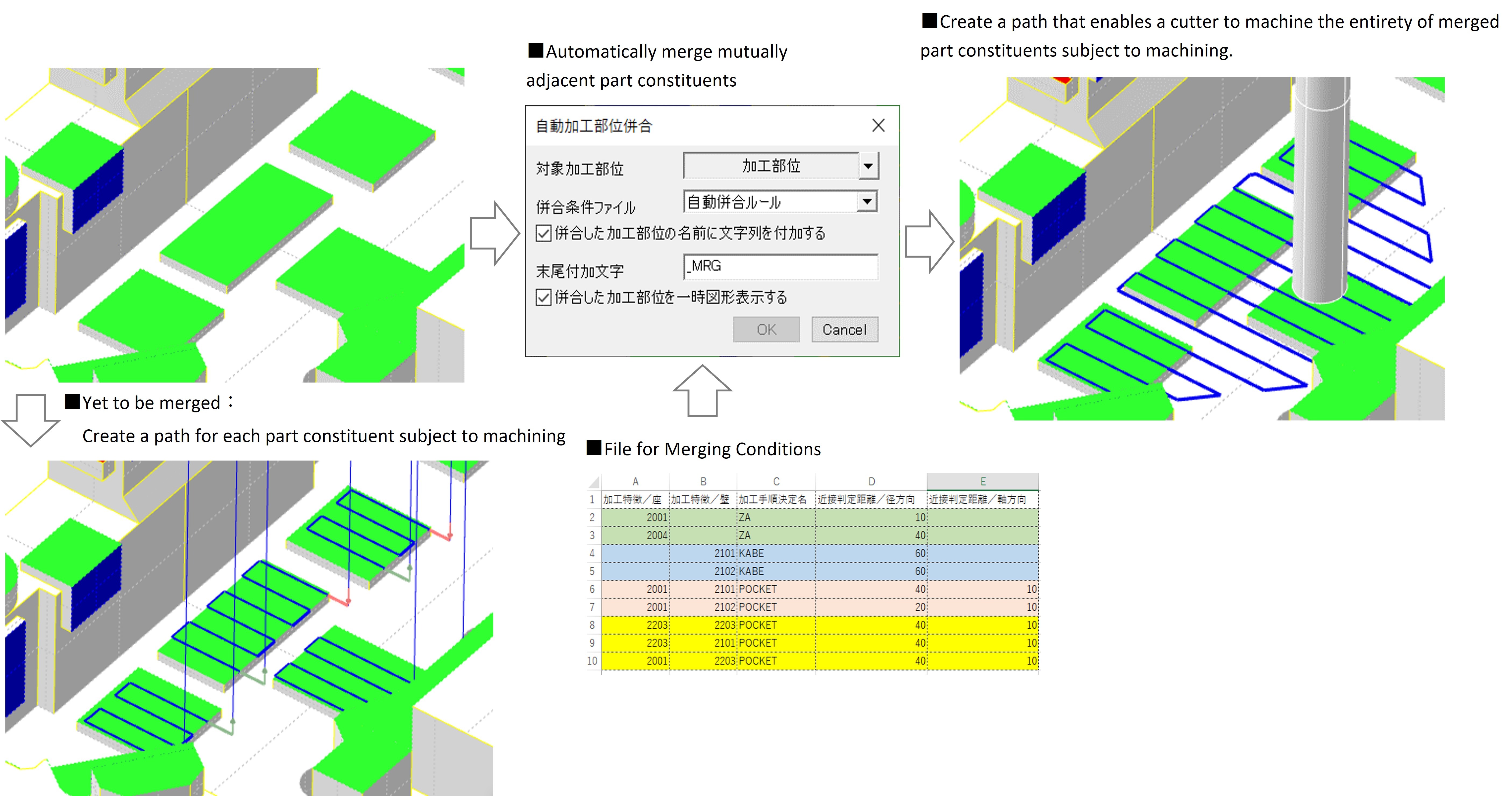 Furthermore, the capability of optimizing the processing sequence enables users to rearrange the NC (numerical control) output sequence pursuant to specified rules (about processing sequences and replacement of tools). Users can also segmentalize the NC output order through the use of tool life.