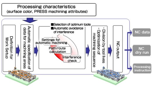 This system automatically processes specified areas based on the characteristics data of processing. It also automatically creates reliable and highly efficient machining paths in order to standardize, automate and optimize the machining of a Structure.