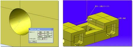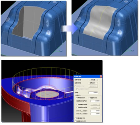 This category of functions to improve the quality of paths include the functions of filling in holes and creating support surfaces for machining. They are: the Form_FillingBase" command, the "Form_FillingNotch" command, the "FillingLargeHole" command, the "CollecVertexDeletion" command, the "TopOp_AddBdCrv" command, the "One-time correction" command, the "AlignEndPnt" command, the "SrfEdgeExtension_Separate" command, the "Create_FuzzyOffsetSurface" command, the "SectionalDieBandSurface" command, the "RemoveDupLines" command, the "Curves unification" command, and the "CompulsoryUniteCrv" command.